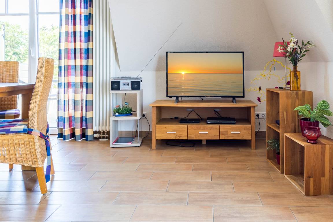 Der Wohnbereich mit SAT-TV und DVD-Player gibt die Möglichkeit her, auf beide möblierten Balkone (Nordost + Nordwest) zu gelangen. Die bequeme Sofaecke sorgt für die nötige Entspannung im Urlaub.