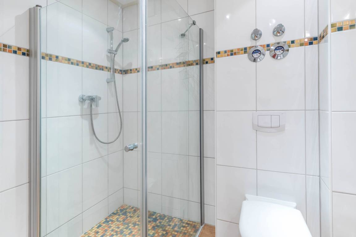 Selbstverständlich gehört zur Ferienwohnung auch ein Badezimmer mit ebenerdiger Dusche und WC.