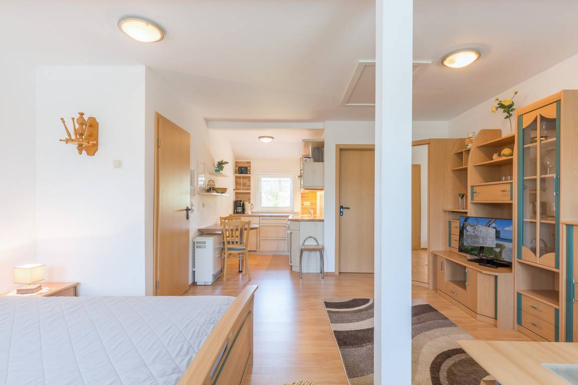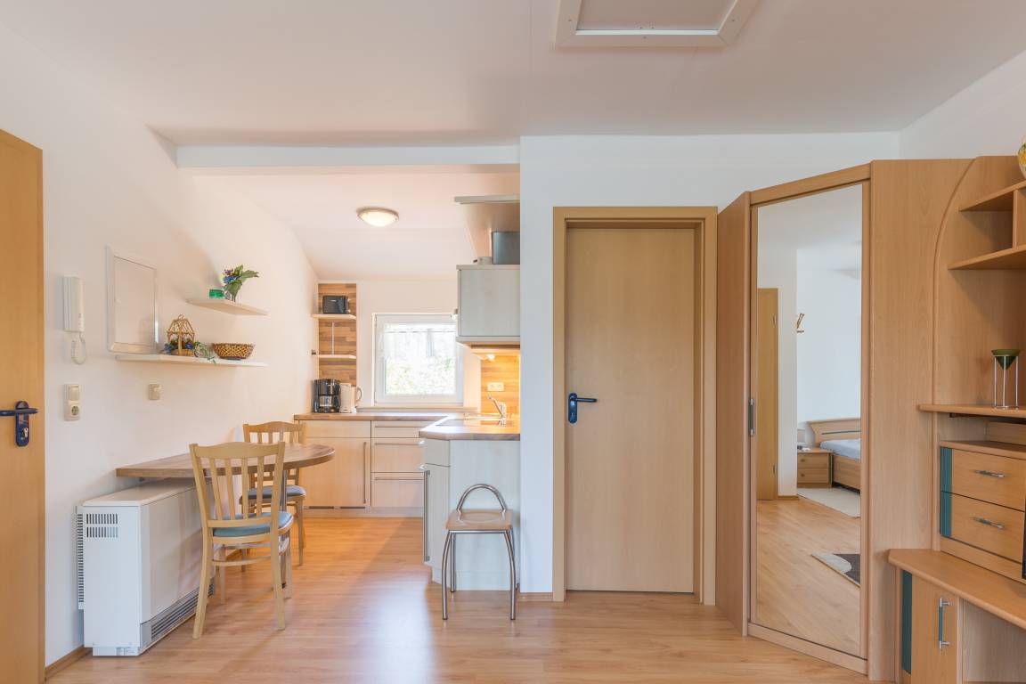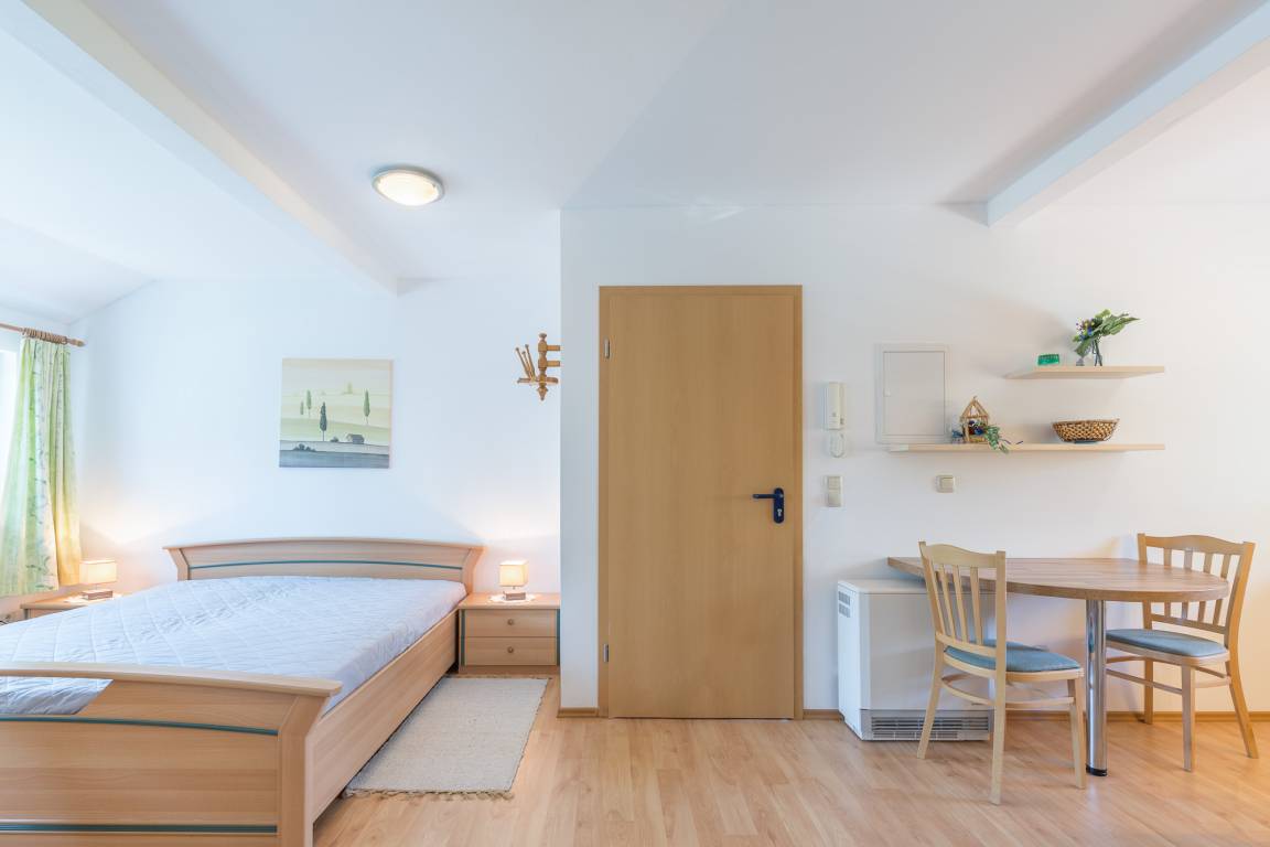 Im ersten Obergeschoss des Ferienhofes Karl's Ruhe befindet sich ein gemütliches 1-Zimmer-Appartement und bietet Platz für 2 Personen.