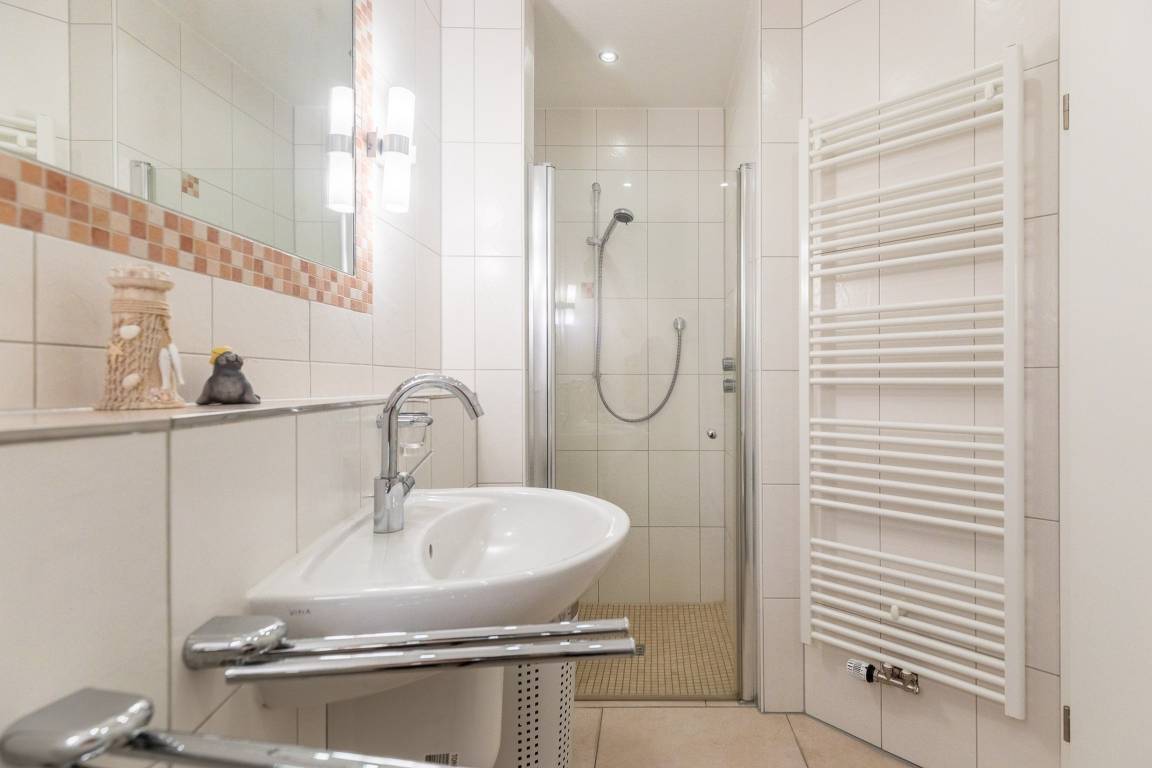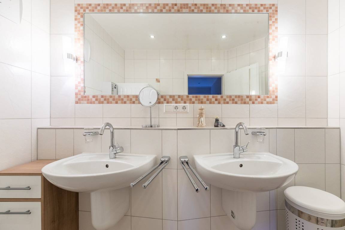Praktischerweise ist das Badezimmer neben einer Dusche mit zwei Waschbecken ausgestattet - optimal für eine Familie. Waschmaschine und Trockner sind hier ebenfalls vorhanden und können gegen Gebühr in Anspruch genommen werden.