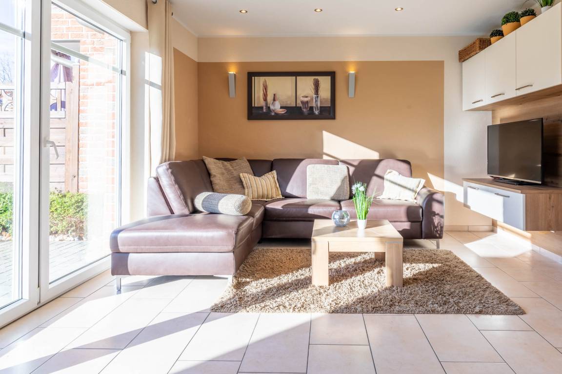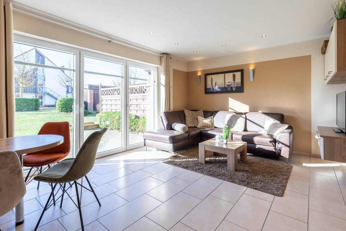 Der Wohnbereich verfügt neben einer gemütlichen Essecke und einem Sat-TV zusätzlich über eine Schlafcouch, die von einer Person genutzt werden kann. Von hier aus begehen Sie die möblierte Südterrasse.