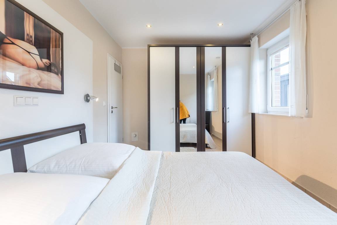 Während das Schlafzimmer mit einem Doppelbett (180x200cm) und großem Kleiderschrank aufwartet, findet man im Kinderzimmer ein Etagenbett und ein Einzelbett (90x200cm).