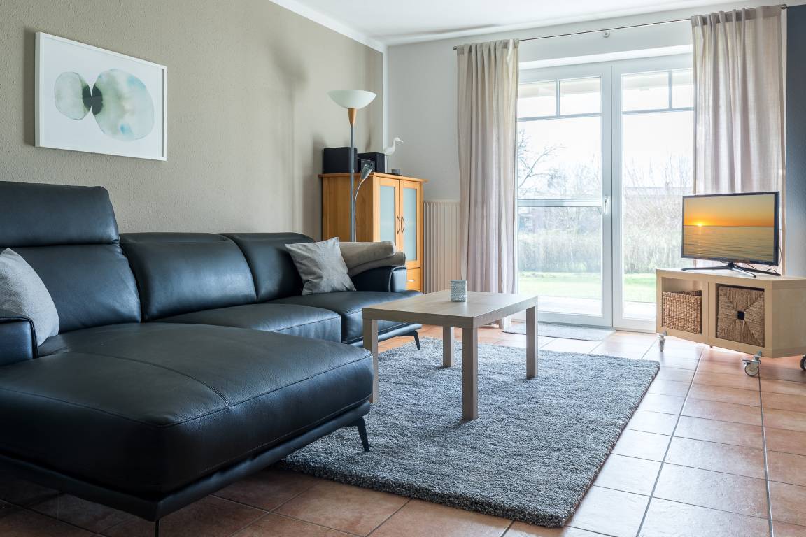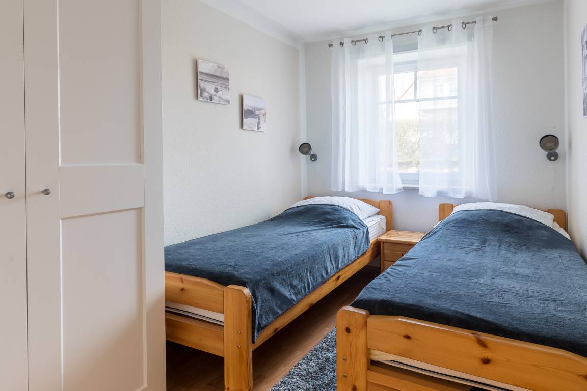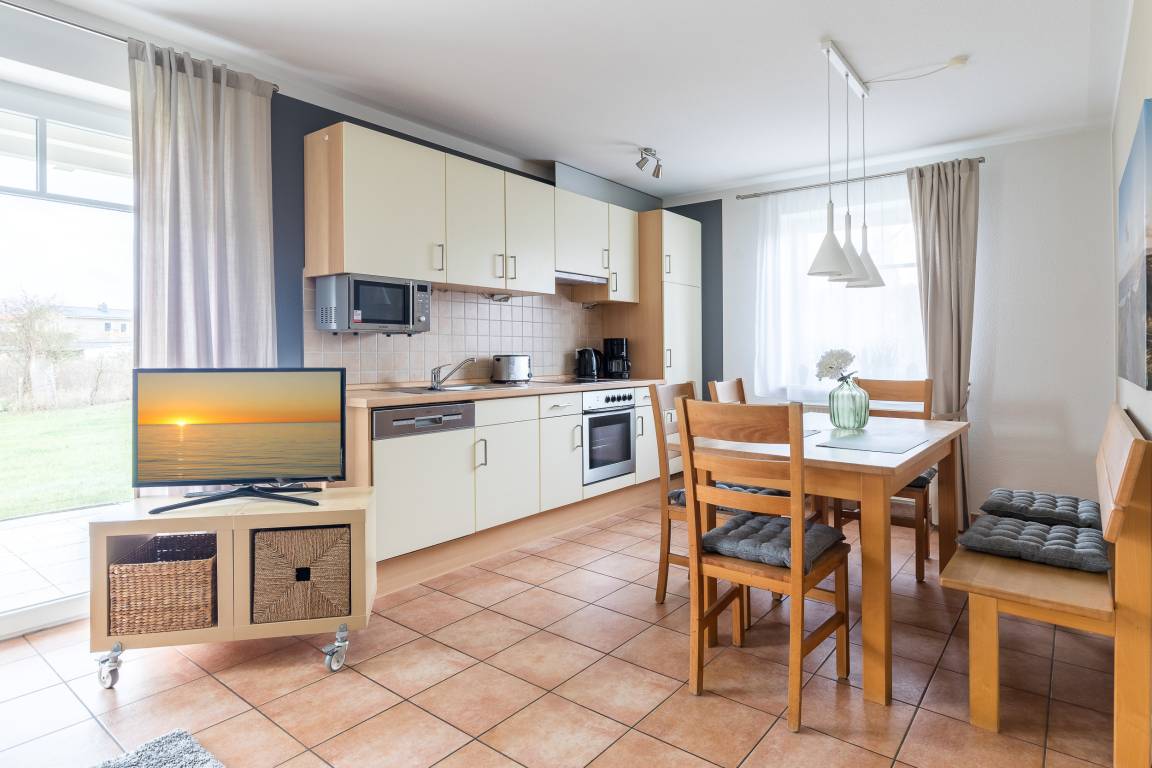 Diese familienfreundlich eingerichtete 3-Zimmer-Wohnung befindet sich im Erdgeschoss und ist auf 58qm Wohnfläche für bis zu 4 Gäste ideal ausgestattet. Der gemütliche Wohnbereich mit einem schönen Ecksofa verfügt über Flatscreen-TV, einen DVD-Player und eine Stereoanlage inklusive Radio. Der modern offene Küchenbereich bietet nicht nur eine Spülmaschine, einen Kühlschrank mit Gefrierfach, eine Mikrowelle sowie einen Herd bzw. Ofen, sondern auch eine separate gemütliche Essecke. In dem Schlafzimmer finden Sie ein großes Doppelbett, das Gäste-/ Kinderzimmer ist mit zwei Einzelbetten ausgestattet. Beide Zimmer bieten zudem einen Kleiderschrank für Ihre Urlaubsgarderobe. Im komfortablen Badezimmer steht neben Dusche und WC auch eine Waschmaschine zur freien Verfügung.