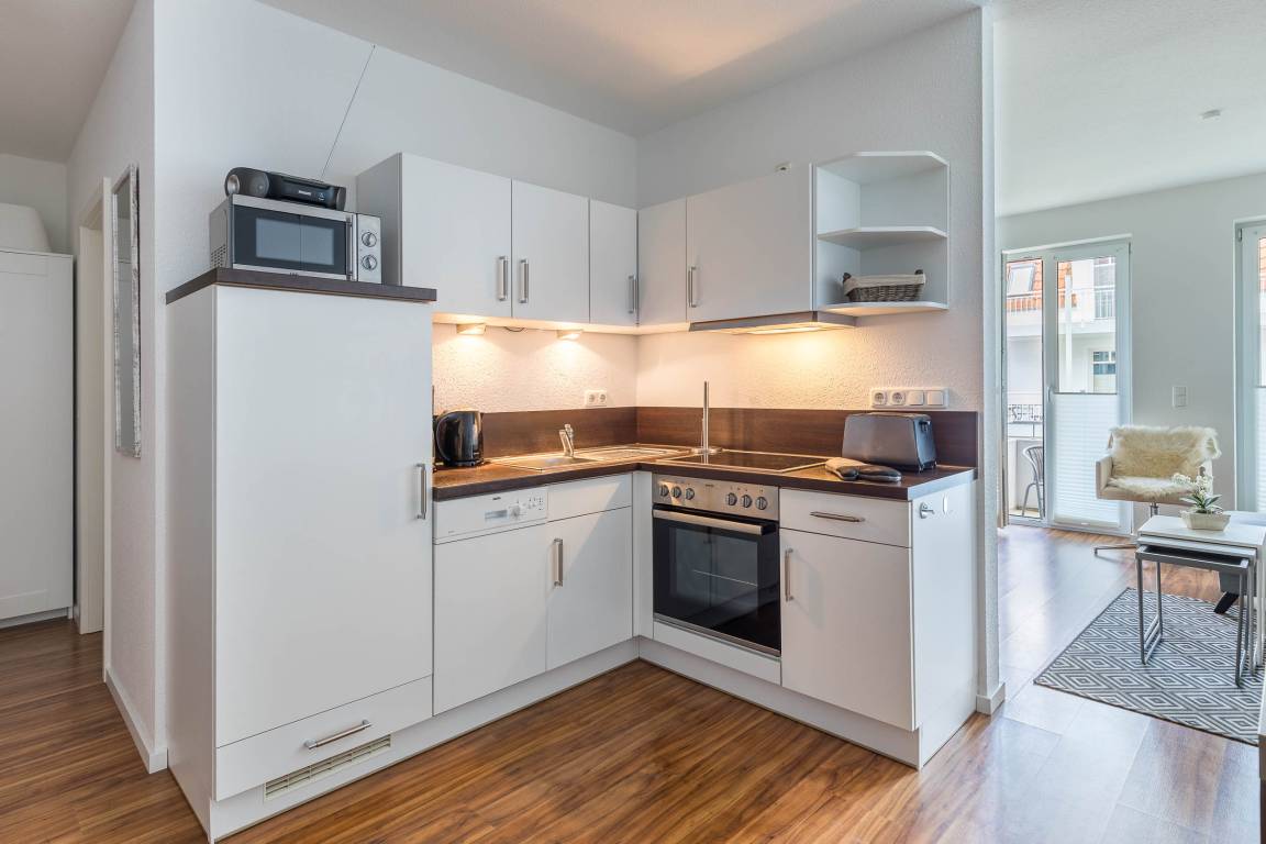 Geschmackvoll eingerichtet ist diese 2-Zimmer-Wohnung im 1.OG mit hauseigenem Fahrstuhl. Hier können sich zwei bis drei Gäste entspannt wohlfühlen.