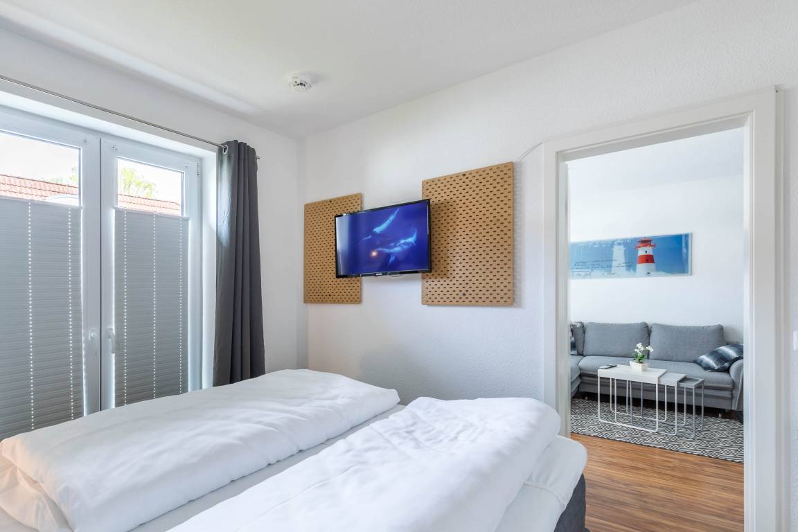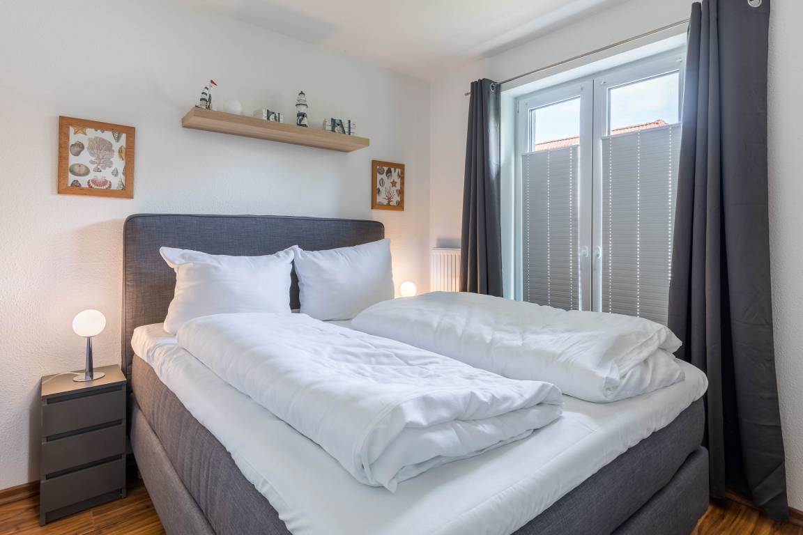 Das Schlafzimmer dieser Ferienwohnung ist mit einem Boxspringbett (160x200m) ausgestattet. Hier gibt es auch einen Kleiderschrank, zwei Nachtschränkchen, einen Radiowecker und einen zweiten Smart-TV.