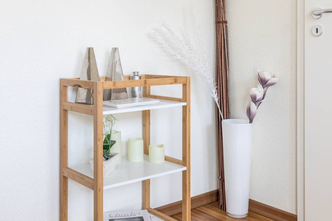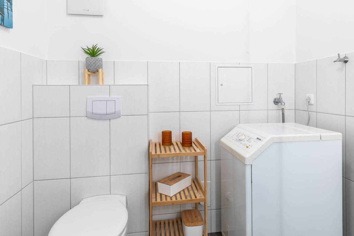 Das Bad ist mit der bodengleichen Dusche seniorengerecht. Auch steht Ihnen hier eine kostenfreie Waschmaschine zur Verfügung. Weitere bereitgestellte Haushaltsgegenstände sind Wäscheständer und Staubsauger.