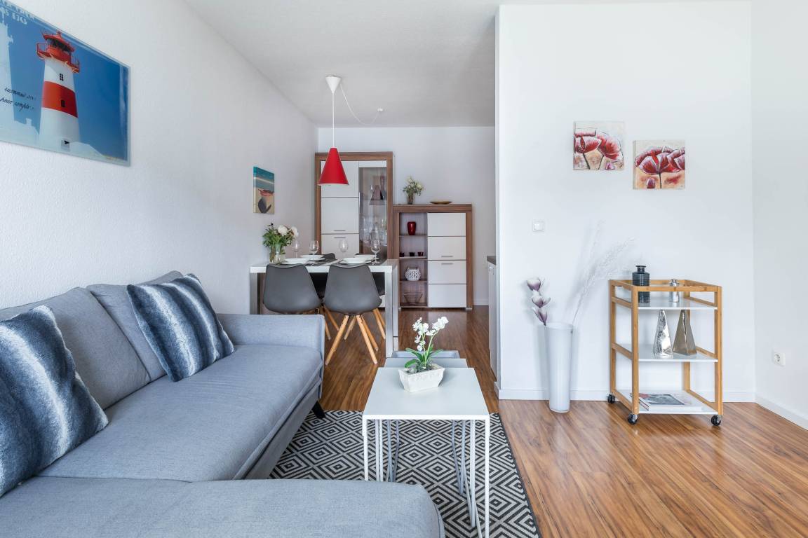 Im offenen Wohn- und Essbereich steht ein schönes Sofa und ein passender Sessel. Sie finden hier auch einen 55-Zoll-Smart-TV (Gäste mit einem eigenen Streaming-Account können diesen hier nutzen), ein CD-Radio sowie einen DVD-Spieler. Dieser Bereich lädt zum Relaxen ein. Falls Bedarf besteht, kann durch das ausziehbare Sofa im Wohnbereich eine weitere Schlafmöglichkeit geschaffen werden. Der Wohnbereich führt sie auf den Balkon mit Gartenmöbeln.
