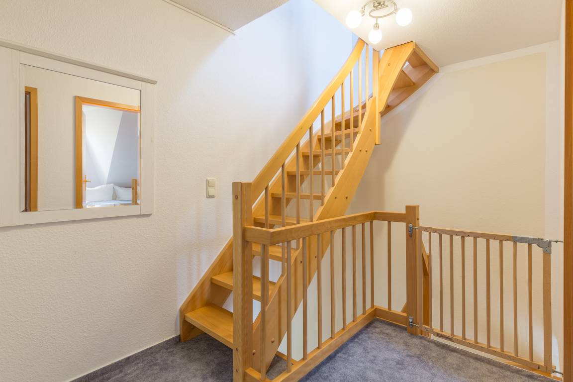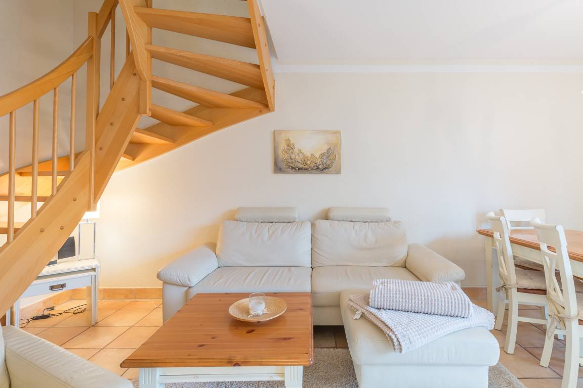 Sie betreten das Ferienhaus und befinden sich im Flur. Von hier aus erreichen Sie das Wohnzimmer. Vom Wohnbereich aus gelangen Sie in die offene Küche. Sie ist mit einem Geschirrspüler, einer Kaffeemaschine und allem, was für die Zubereitung Ihrer Mahlzeiten benötigen, ausgestattet.