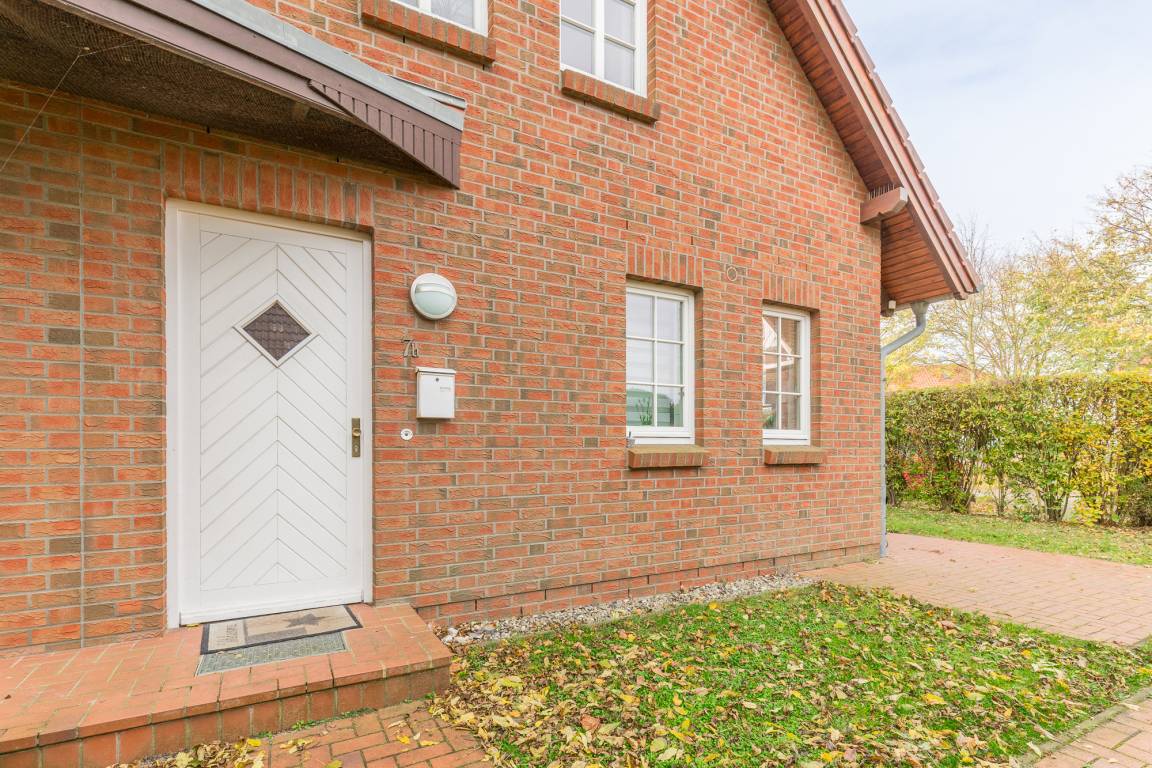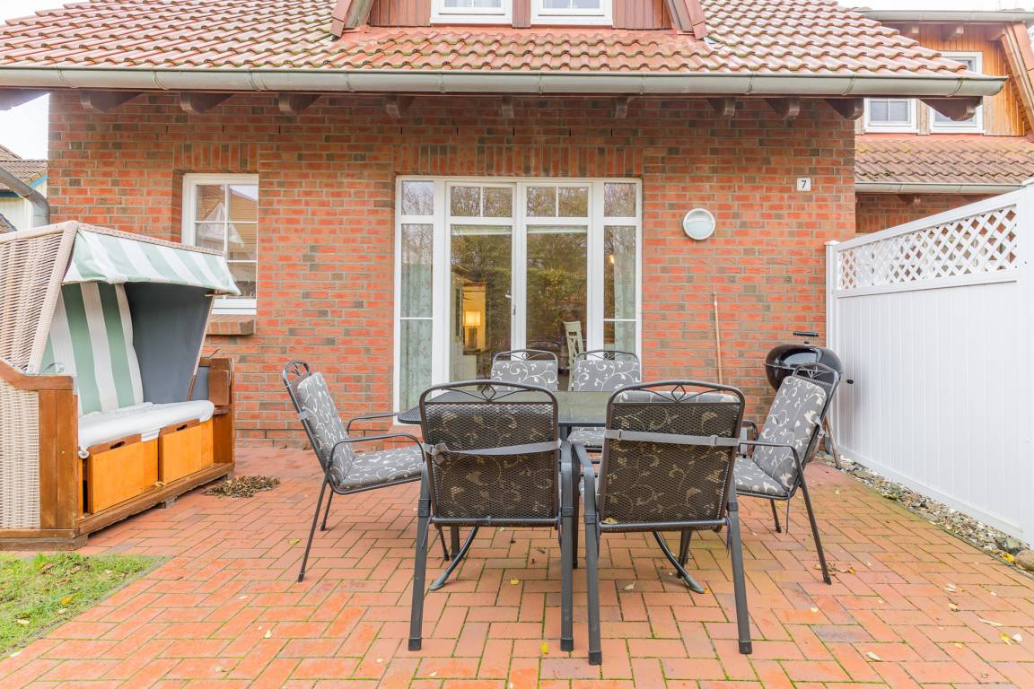 Vom Wohnzimmer aus gelangen Sie auf die begrünte, kleine Terrasse. Die vorhandene Hecke bietet Sichtschutz und Privatsphäre für das Familienfrühstück auf der Terrasse. Auf der andern Seite befindet sich der Außenstellplatz. Ein schöner Strandkorb auf der Terrasse rundet das Angebot ab.