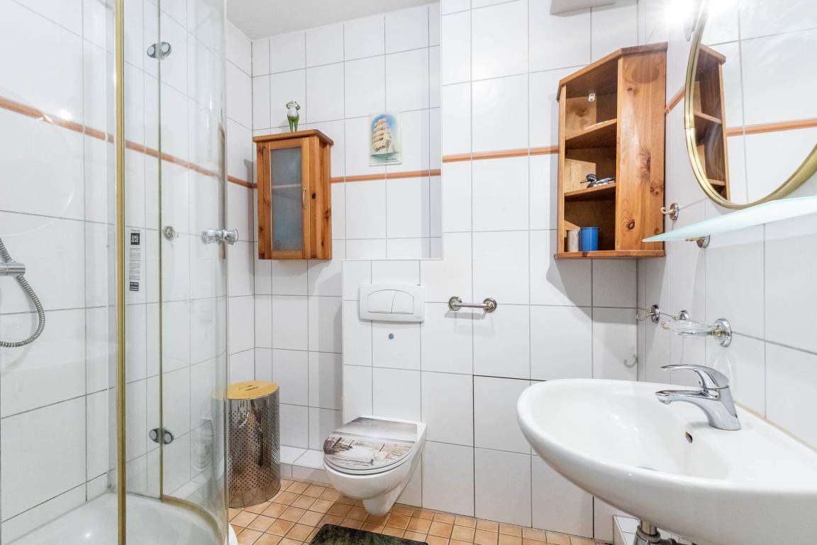 Das moderne, innenliegende Badezimmer bietet eine Dusche und WC. Die Handtuchheizung sorgt für wohlige Wärme.