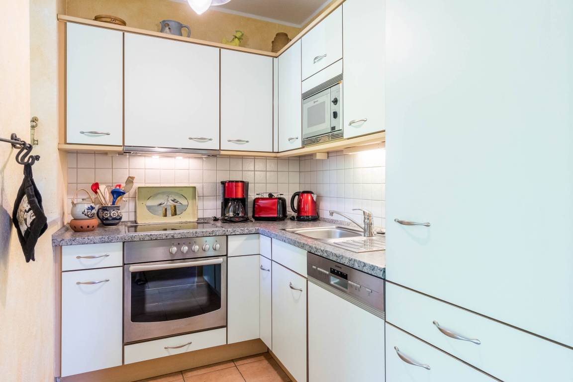 In der komfortablen offenen Küche befinden sich hilfreiche Haushaltsgeräte von der Mikrowelle bis zum Geschirrspüler.
