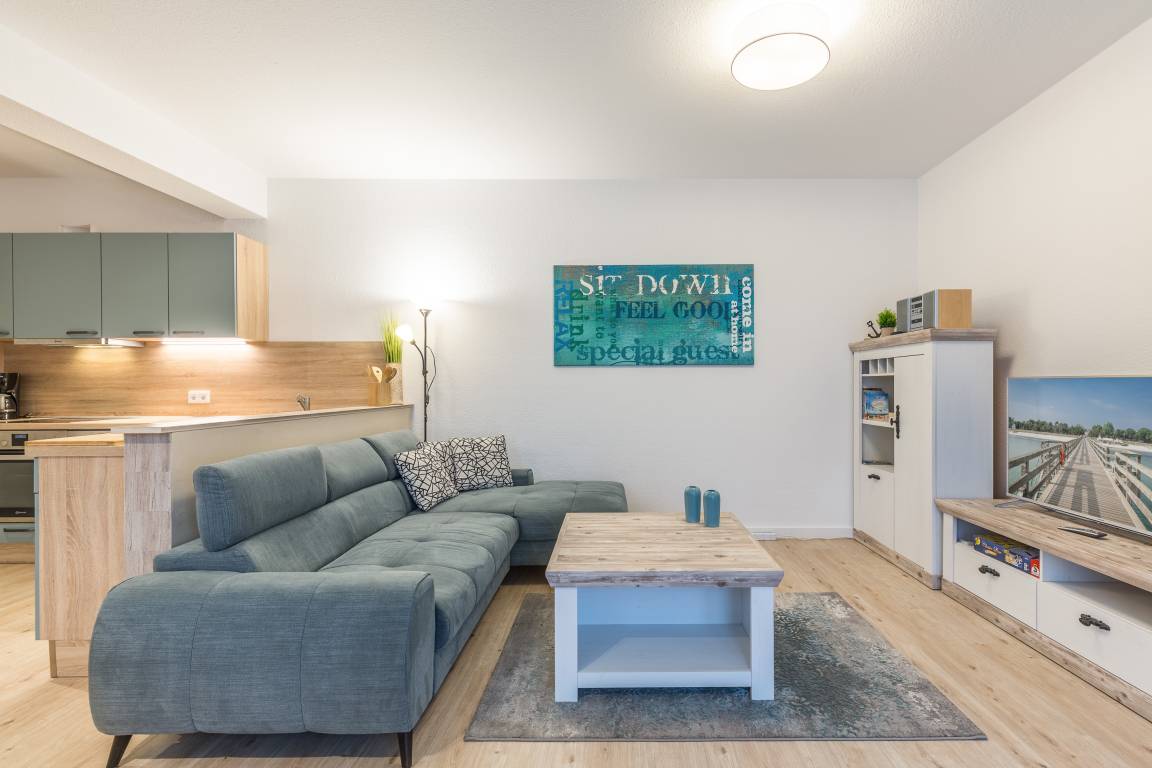 Das Schlafzimmer und das Duschbad mit bodengleicher Dusche haben eine großzügige Raumgröße. Im großen Wohnbereich befinden sich Essbereich und die moderne Einbauküche. Sie ist offen gestaltet und bietet einen schönen Blick in den angrenzenden Wohnraum. Der Geschirrspüler hilft beim Abwasch. Filter-Kaffeemaschine, Wasserkocher und Toaster zählen zur Grundausstattung in unseren Ferienwohnungen.