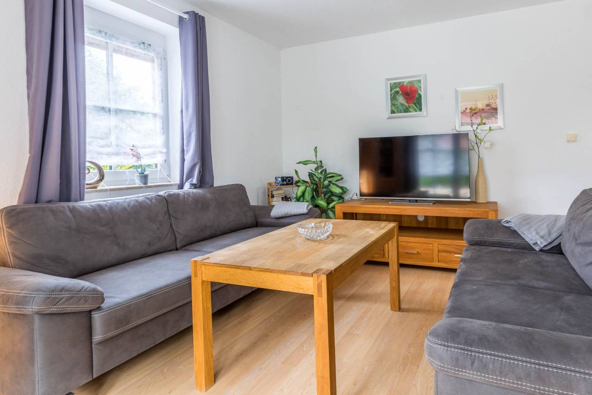 Zur Einrichtung des Wohnzimmers gehört neben einer gemütlichen Sitzecke, Holzmöbeln natürlich auch ein Flatscreen-TV (Sat).