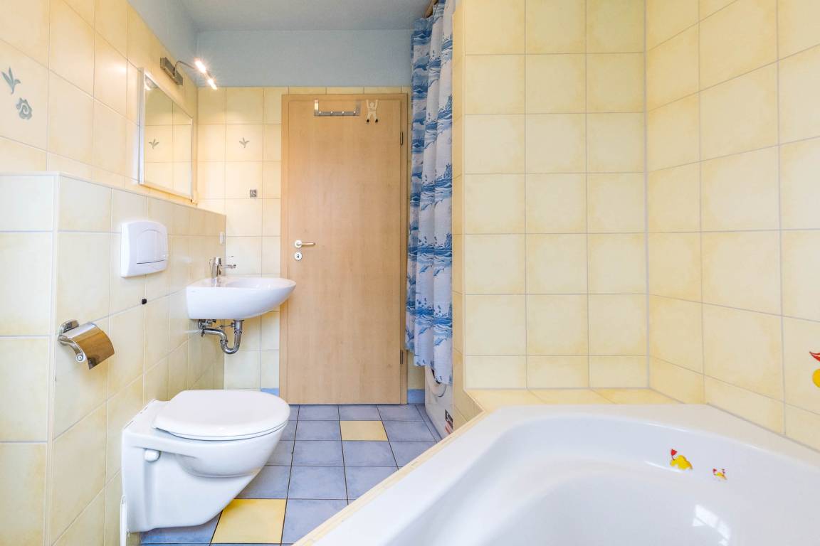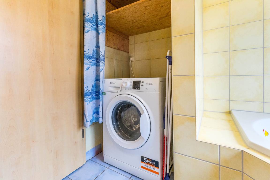 Im Badezimmer lädt eine Eckbadewanne zum Entspannen in wohltemperiertem Wasser ein. Auch Waschmaschine ist hier installiert. Das Fenster spendet angenehmes Tageslicht und hilft beim Lüften nach dem Baden/ Duschen. Der Handtuchtrockner spendet zusätzlich wohlige Wärme im Bad.