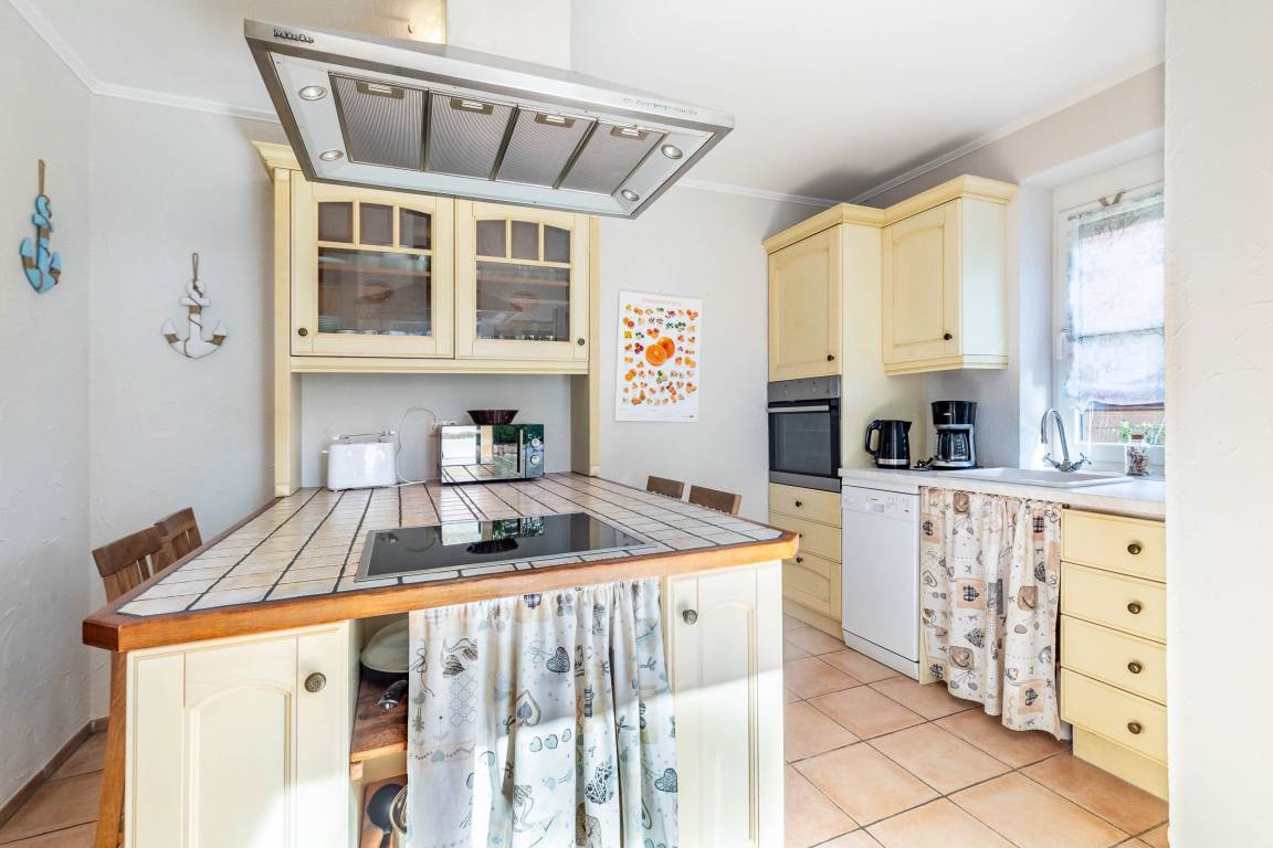 In der offenen Küche gibt es vielerlei hilfreiche Geräte für Ihre Selbstverpflegung - von der Mikrowelle bis zum Geschirrspüler - und eine Essecke an der Kochinsel.