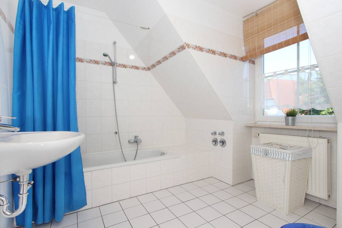 Das helle und freundliche Badezimmer verfügt über Badewanne und WC.