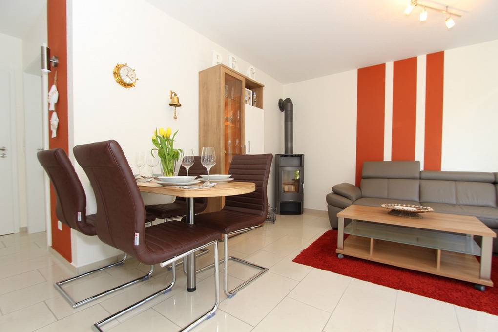 In dieser komfortablen 2-Zimmer-Ferienwohnung im EG finden Sie auf 50qm Wohnfläche für 4 Gäste einen großzügigen, kombinierten Wohn- und Essbereich mit Kamin.