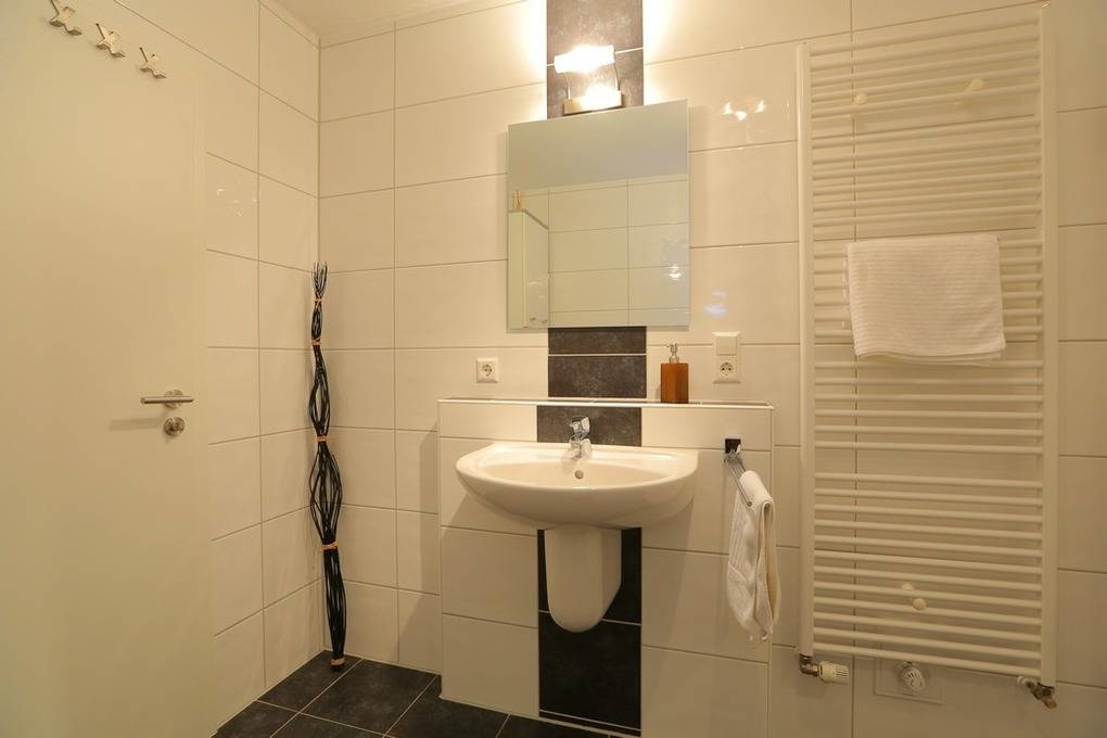 Das moderne Bad bietet eine ebenerdige Dusche, WC und Waschbecken.
