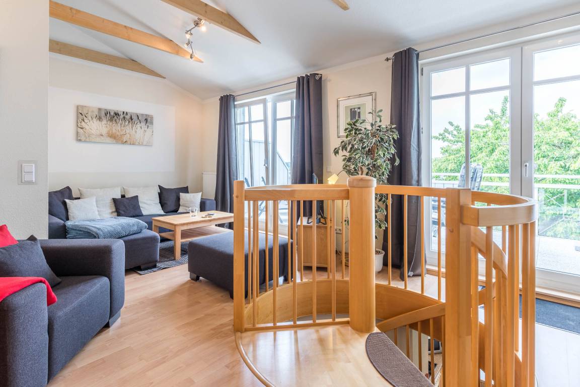Wohnbereich mit Flair: Im Dachgeschoss erwartet Sie ein heller und offen gestalteter Wohnbereich als offene Galerie. Finden Sie Ihren Lieblingsplatz auf der großen Couchlandschaft und genießen Sie das Ambiente zum Wohlfühlen, Lesen und Träumen.