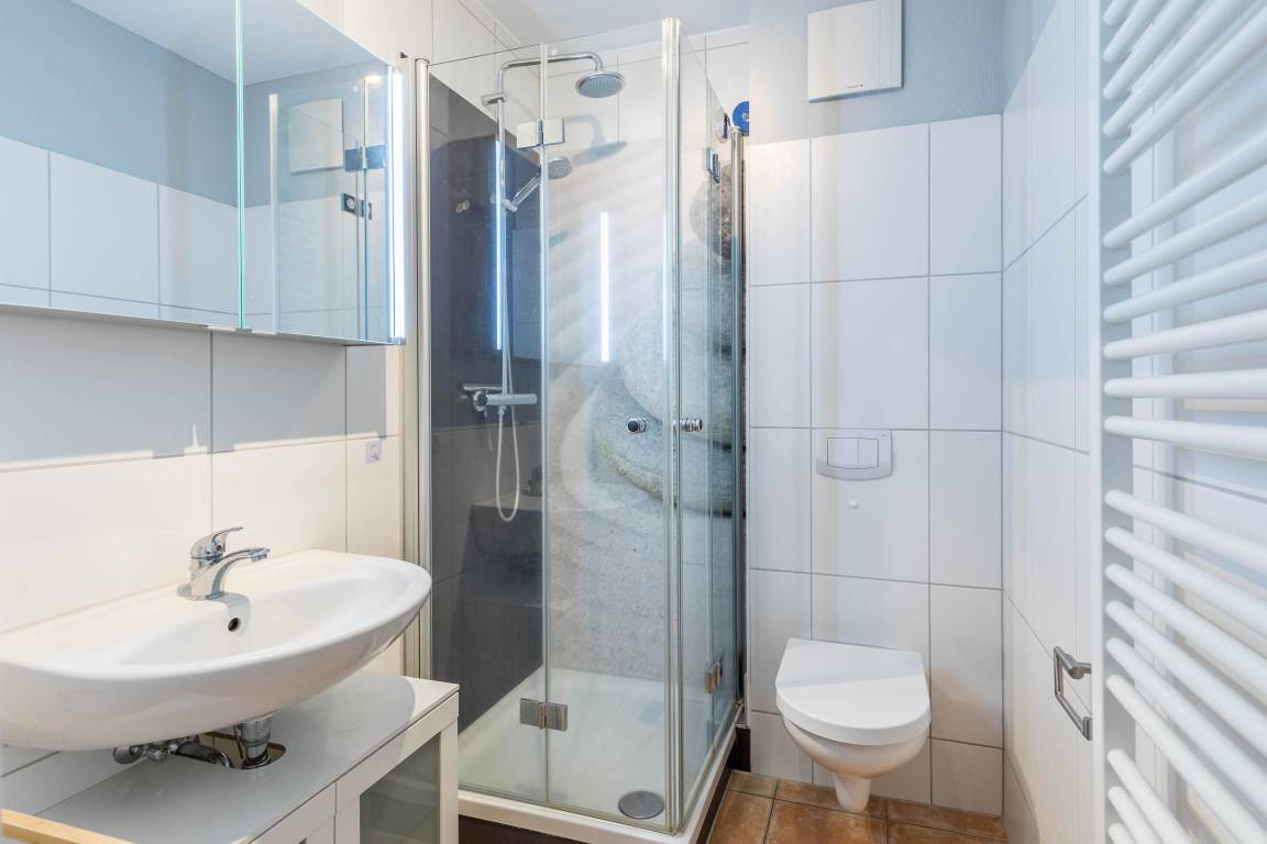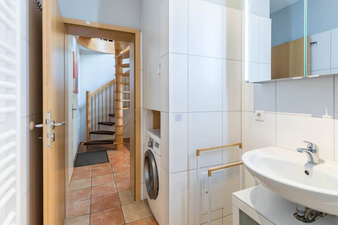Modernes Badezimmer mit Extras: Das Badezimmer verfügt über eine Dusche und ein WC sowie eine Waschmaschine, die Ihnen kostenfrei zur Verfügung steht.