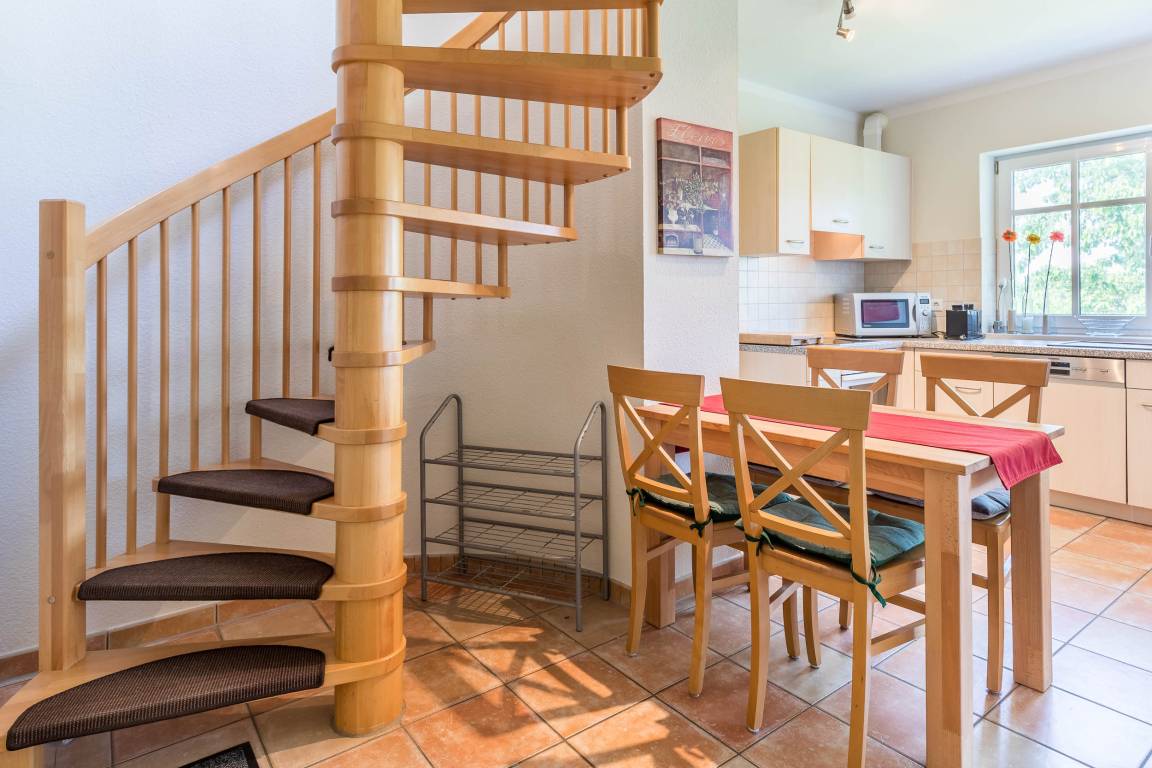 Moderne Küche mit technischem Komfort: Die offene Küche im unteren Bereich ist der perfekte Ort für gemeinsame Mahlzeiten an dem Esstisch für 4 Personen. Ausgestattet mit Spülmaschine, Kühlschrank mit Gefrierfach, Herd, Backofen, Kaffeemaschine und Wasserkocher, lässt unsere Küche keine Wünsche offen.