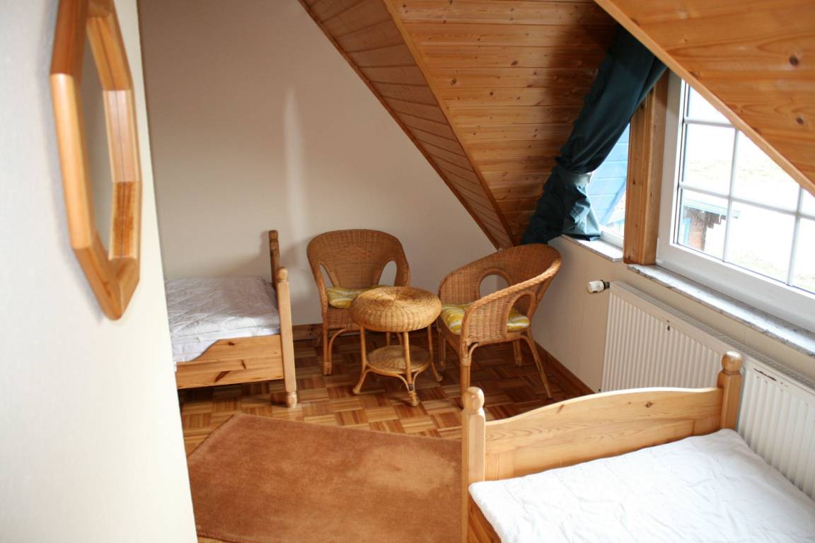 Im Obergeschoss bieten zwei Schlafzimmer mit je zwei Betten (einmal Doppelbett) und im Dachgeschoss ein Schlafzimmer mit ebenfalls zwei Betten genügend Platz.