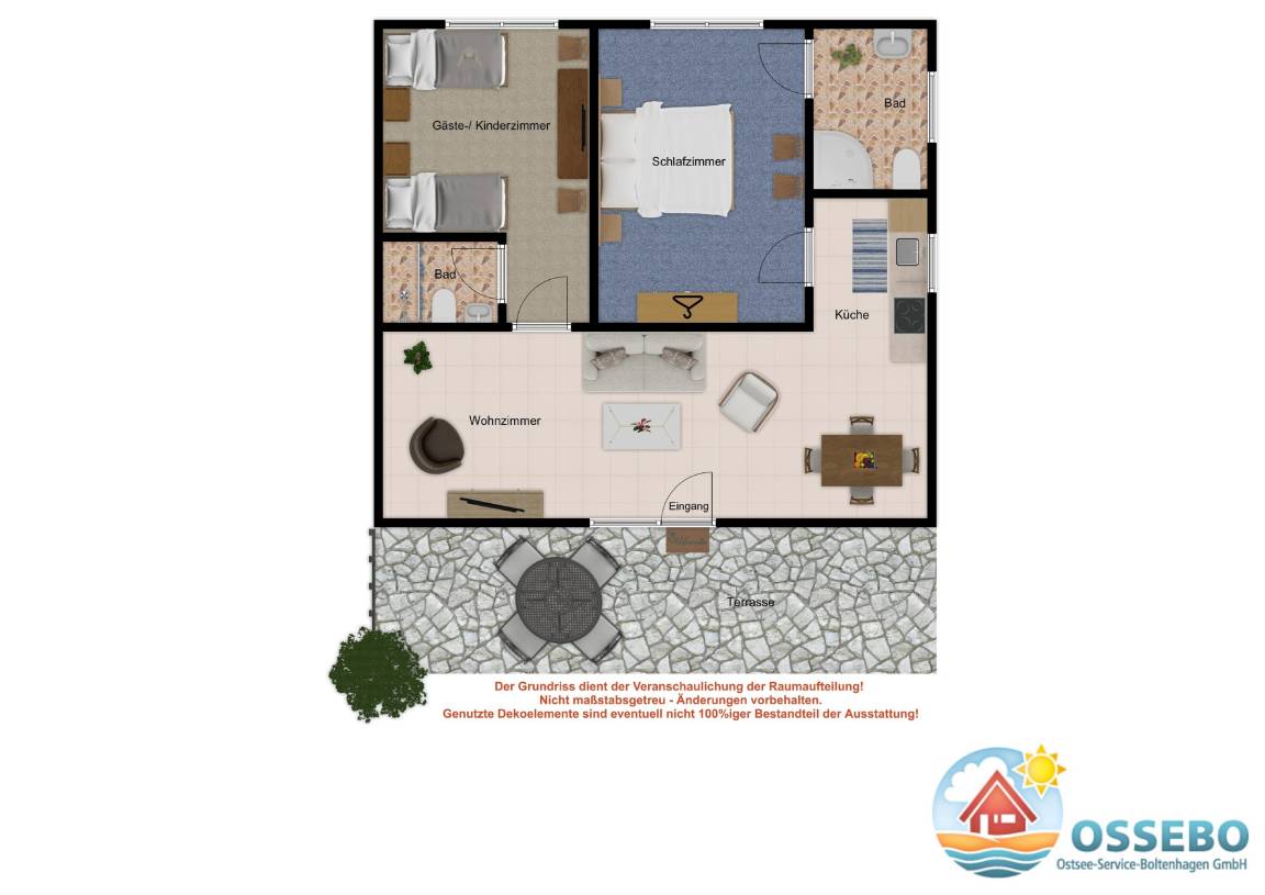 Diese 3-Zimmer-Ferienwohnung des Doppelbungalows "Marina" bietet auf ca. 70qm Wohnfläche eine Ausstattung für bis zu 4 Gäste.