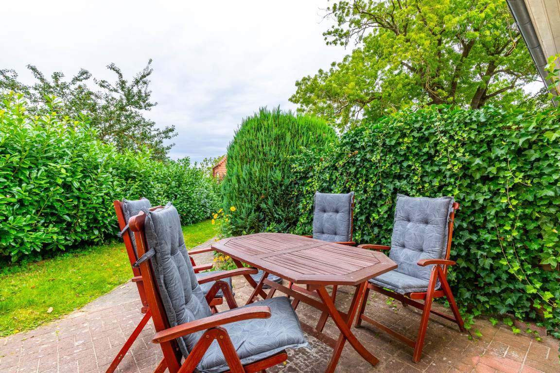 Die Sonne können Sie auf der möblierten West-Terrasse genießen. Etwas Grün drum herum macht die Idylle perfekt. Eine Holz-Trennwand zur Nachbar-Terrasse wahrt optisch Ihre Privatsphäre.