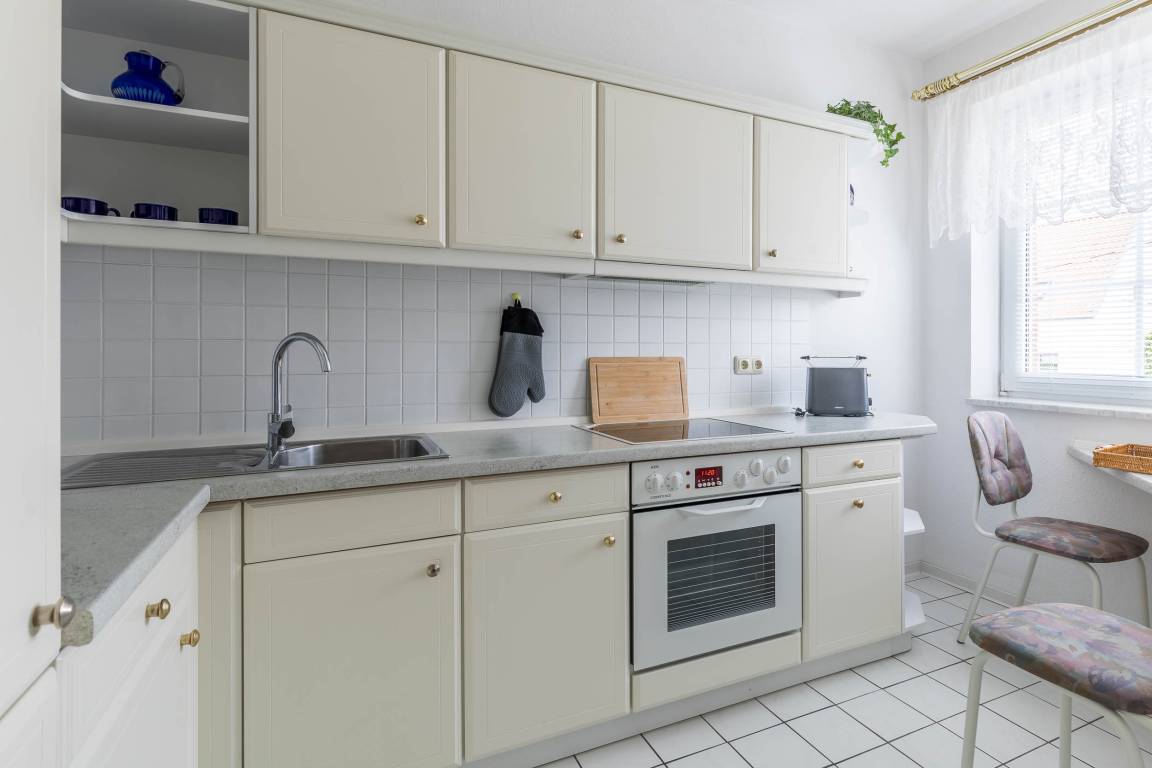Die Küche ist komplett und zeitgemäß ausgestattet und sorgt für eine problemlose Selbstversorgungsmöglichkeit. So finden Sie hier neben einem Wasserkocher, einer Kaffeemaschine, Herd und Kühlschrank.