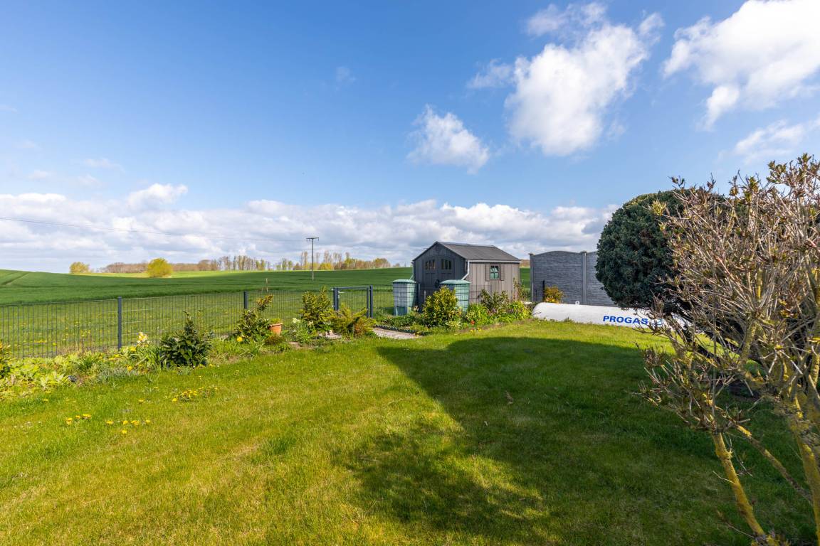 Bei einer komfortablen Ausstattung sorgt im Wohnbereich ein Flatscreen-TV für gute Unterhaltung. Auf der großen Sofalandschaft lässt es sich dazu gemütlich sitzen. Die separate Essecke bietet Ihnen die Möglichkeit, bequem z.B. Ihre Mahlzeiten einnehmen zu können. Von hier aus erreichen Sie auch die möblierte große Nordwest-Terrasse mit herrlichem Ausblick in die Natur und angrenzendem kleinen Grundstück. Das Grundstück ist eingezäunt, ein Teil mit Hecke, größtenteils mit Zaun.