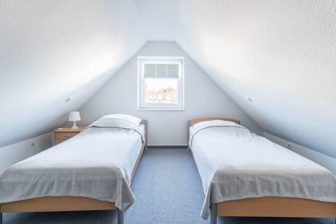 Ganz oben, im Dachgeschoss als 3. Ebene, ist eine offene Galerie mit 2 Einzelbetten und einer Kommode eingerichtet.