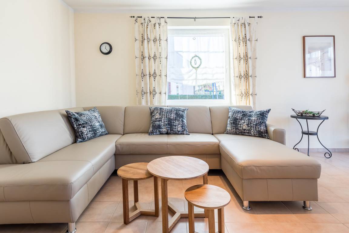 Im Erdgeschoss befindet sich ein verbundener Wohn- und Essbereich mit einer komfortabel ausgestatteten separaten Küchenzeile, die über alle notwendigen Küchengeräte verfügt, um eine bequeme Selbstversorgung zu ermöglichen. Die schöne große Sofalandschaft und Flatscreen-TV plus DVD-Player laden im Wohnzimmer zum gemütlichen Beisammensein ein. Eine Fußbodenheizung sorgt für eine ganzjährige Behaglichkeit.