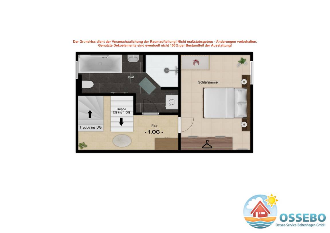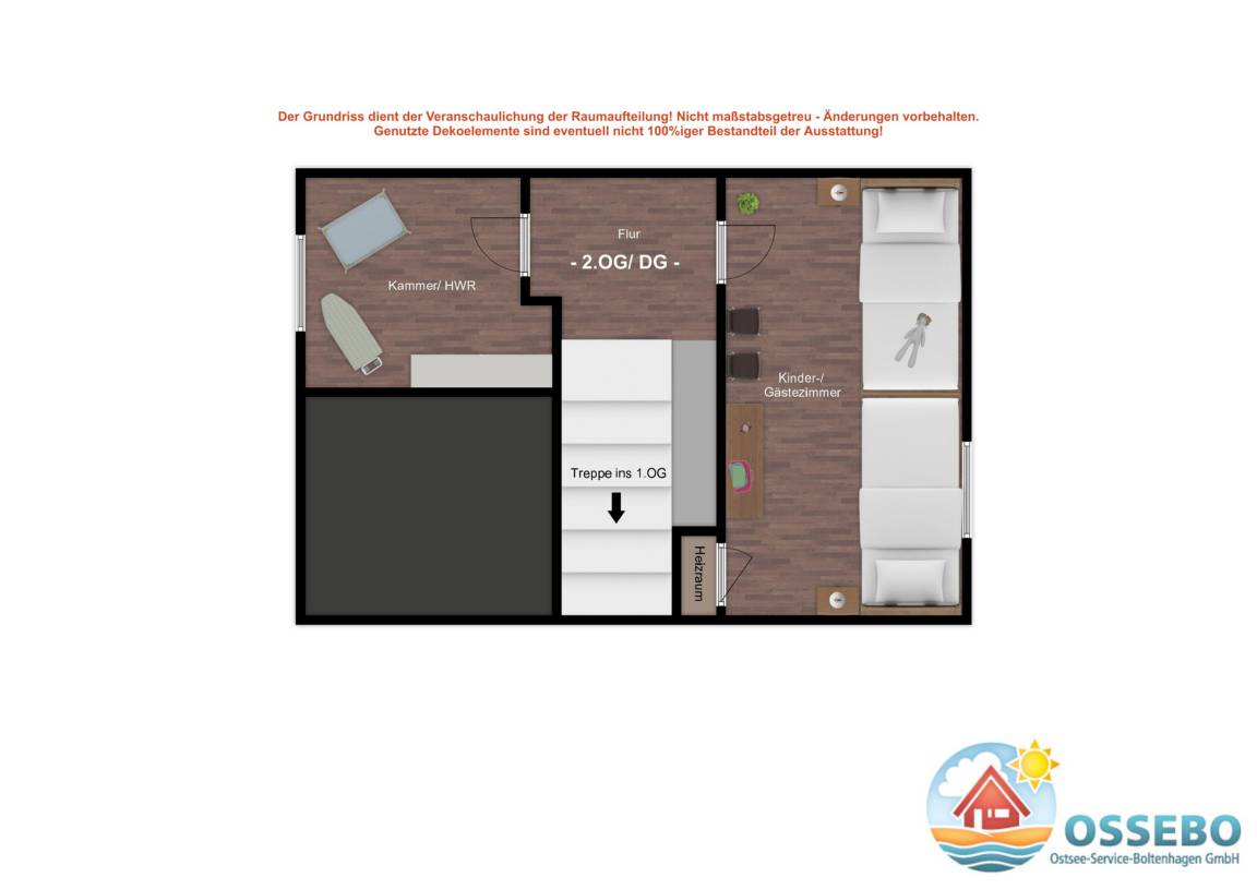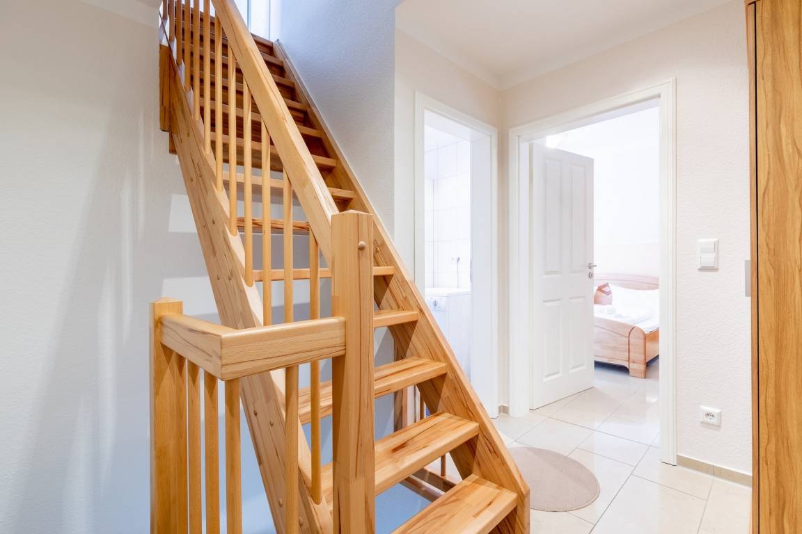 Die dritte Wohnebene, im DG, welche Sie über eine offene Holztreppe erreichen, ist mit einem weiteren Schlafzimmer mit zwei Einzelbetten (je 90x200cm) und einer Kommode ausgestattet. Ein Reisebettchen könnte hier bei Bedarf auch aufgestellt werden.
