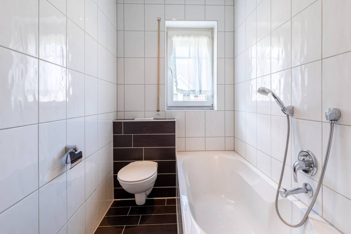 Auf dieser Etage gibt es weiterhin ein geräumiges Bad mit einem WC, einer Dusche und einer Badewanne. Die Waschmaschine hier im Bad können Sie gern kostenfrei nutzen. Das Fenster im Bad spendet Tageslicht und erleichtert das Lüften, z.B. nach dem Duschen.