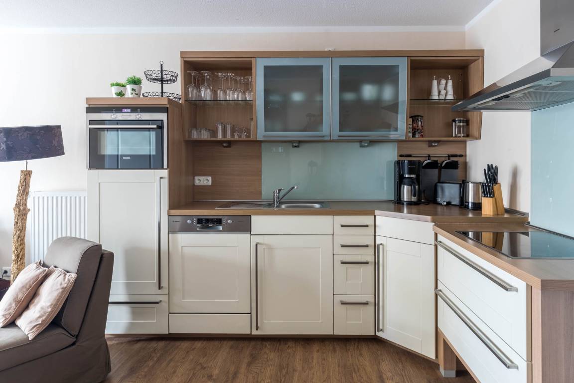 Die umfangreiche Kücheneinrichtung besteht unter anderem aus einem Cerankochfeld, einem Backofen, einem Kühlschrank mit Gefrierfach und aus einem Geschirrspüler.