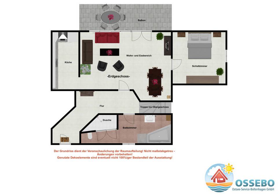 Vom Wohn-/ Essbereich aus können Sie den großen möblierten Süd-Balkon betreten und die frische Ostseeluft genießen.