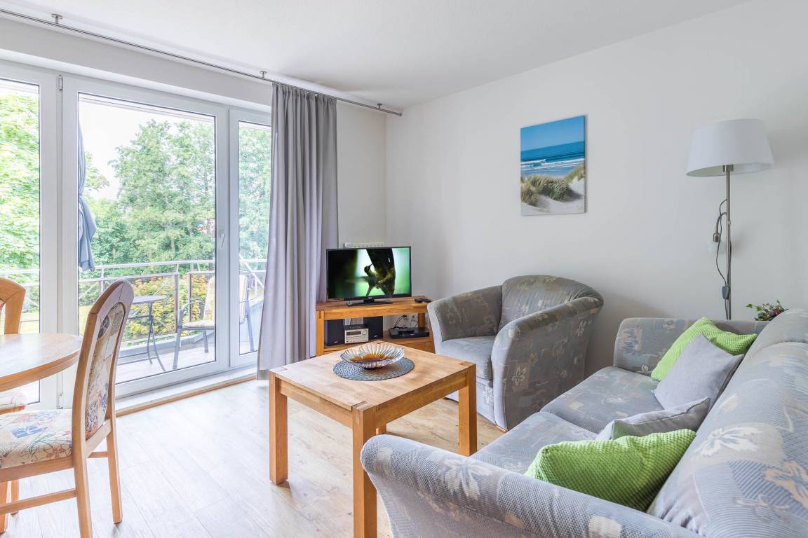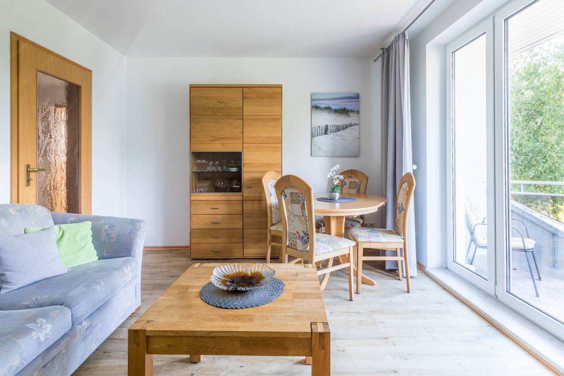 Das Feriendomizil bietet ein mit elegantem Mobiliar ausgestattetes Wohnzimmer mit gemütlicher Couch und Essecke. Wer getrennt schlafen möchte, kann hier gern die Couch ausziehen, sie hat ausgezogen eine Liegefläche von 150x200cm. Zur Unterhaltung finden Sie hier Flatscreen-TV, DVD-Player und auch eine kleine Musikanlage.