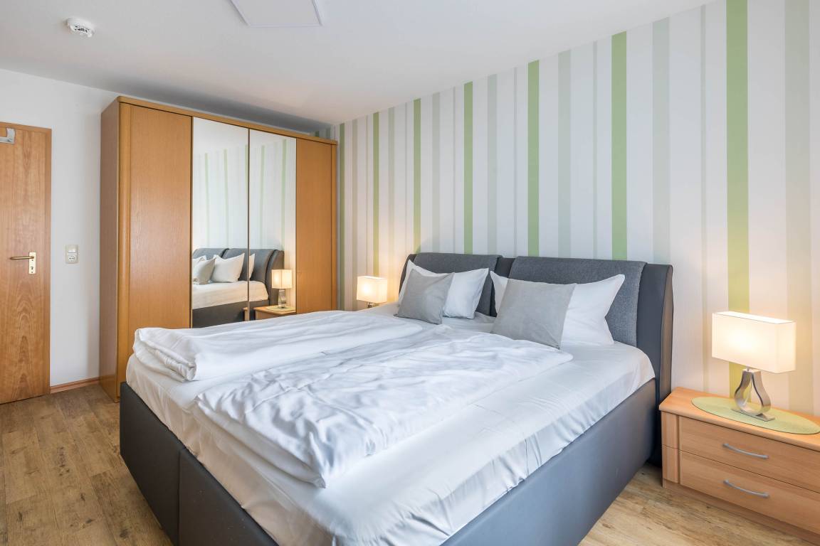 Nach einem schönen Tag können Sie gemütlich in dem Schlafzimmer mit Doppelbett (Boxspringbett 180x200cm/ Höhe 60cm) schlummern. Ein Kleiderschrank für Ihre Urlaubsgarderobe und ein 2. SAT-TV runden die Ausstattung im Schlafzimmer ab.