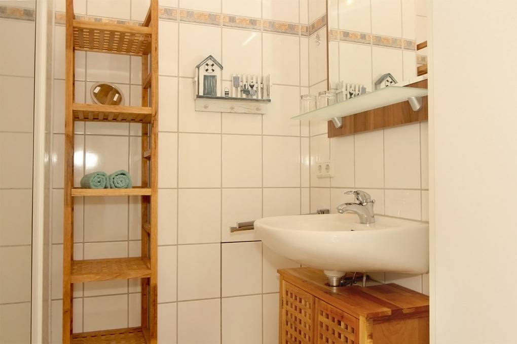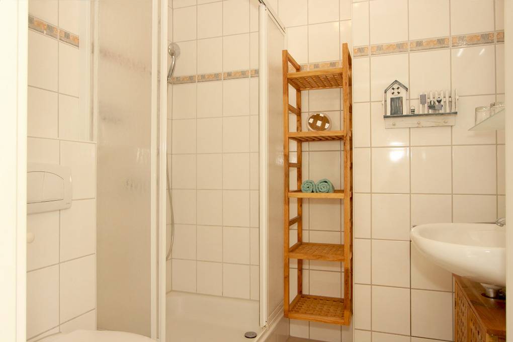 Ein modernes Duschbad schließt sich vom Flur aus an.