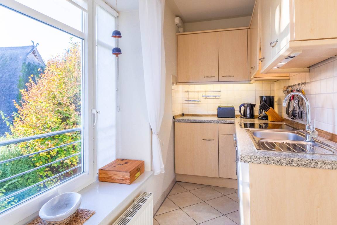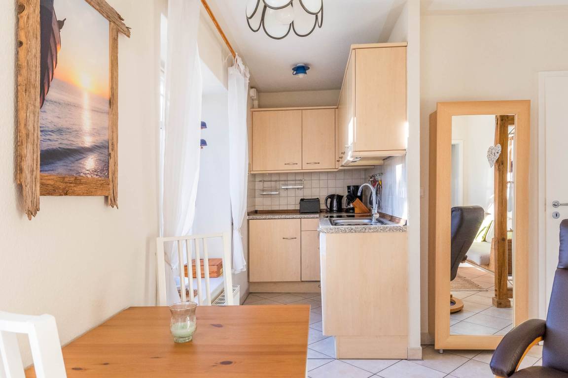 In der modernen Wohnküche finden Sie u.a. einen Herd mit Cerankochfeld, einen Backofen sowie einen Kühlschrank mit Gefrierfach vor. Auch eine kleine Essecke befindet sich hier.