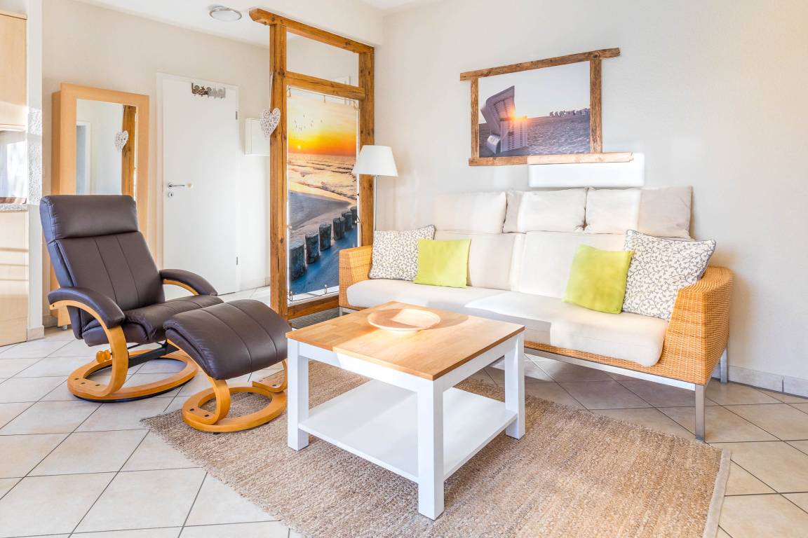 Der kombinierte Wohn- und Essbereich bildet das Zentrum der Ferienwohnung. Machen Sie es sich auf der Couch bequem, ein Flatscreen-TV (Sat) sorgt für Unterhaltung.