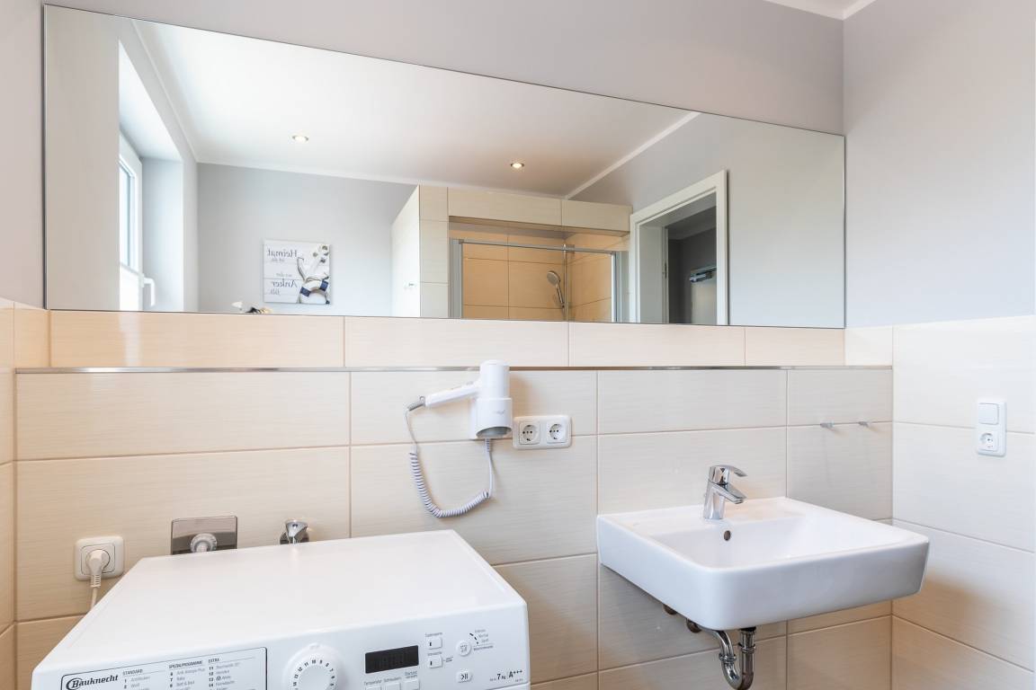 Das moderne Bad mit Tageslicht bietet eine barrierefreie Dusche, Waschbecken, WC und auch eine Waschmaschine.