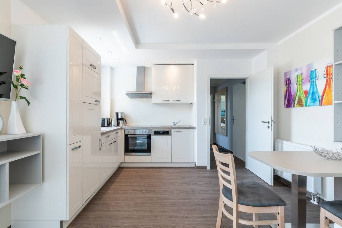 Zur gut ausgestatteten offenen Küche gehört auch schöner ein Essbereich für 2 Personen.