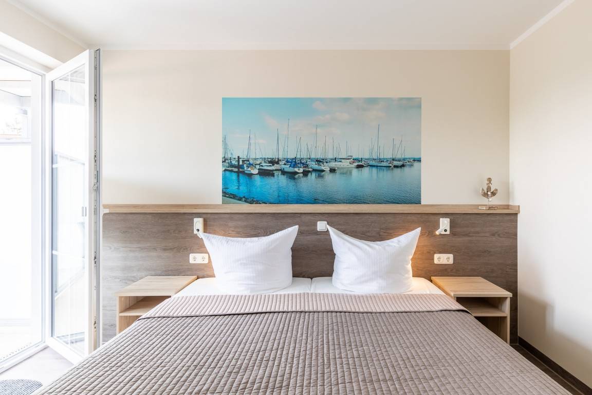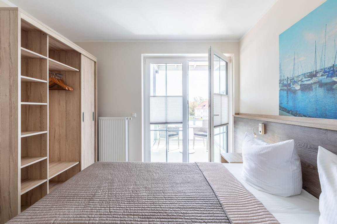 Das Schlafzimmer ist mit einem Doppelbett und einem geräumigen Kleiderschrank ausgestattet. Von hier aus erreichen Sie den zweiten Balkon.