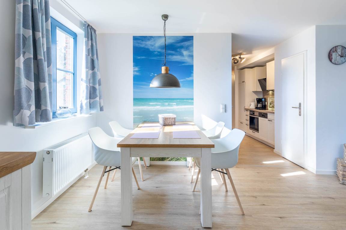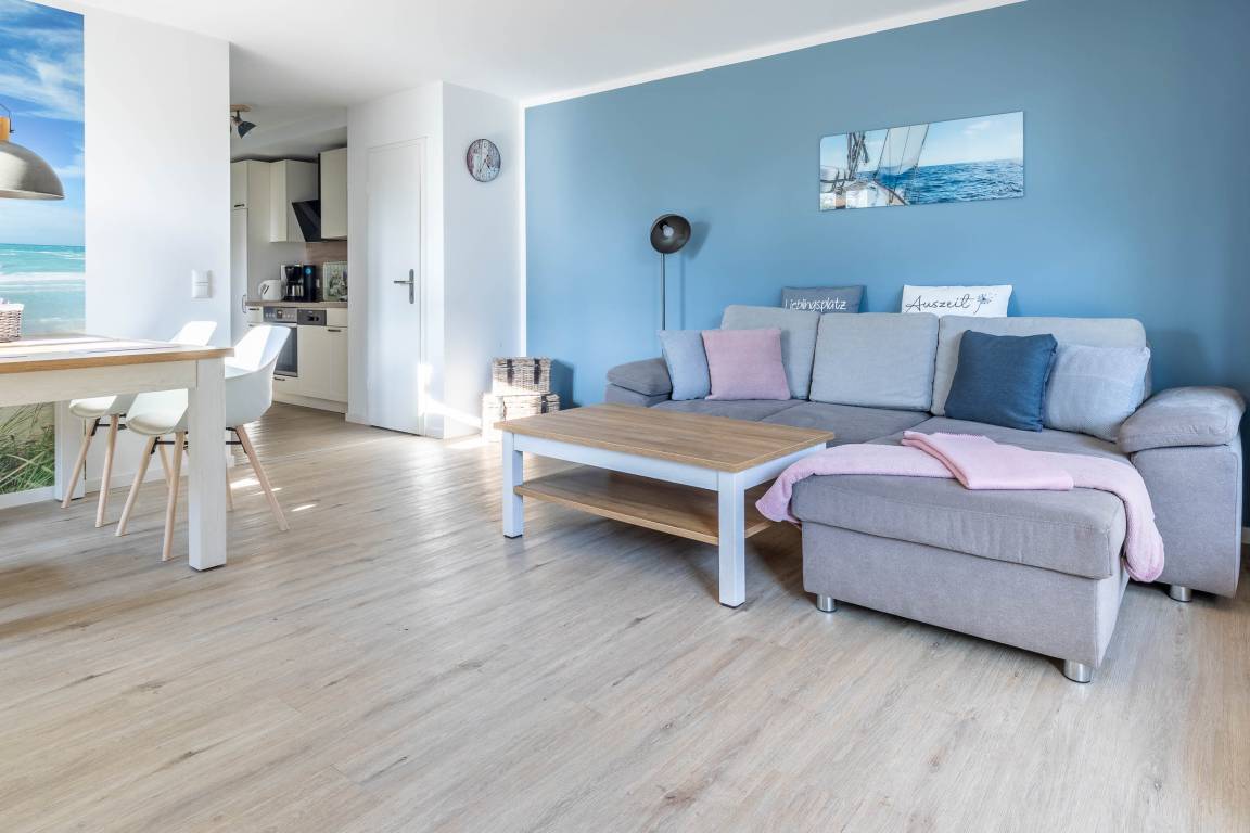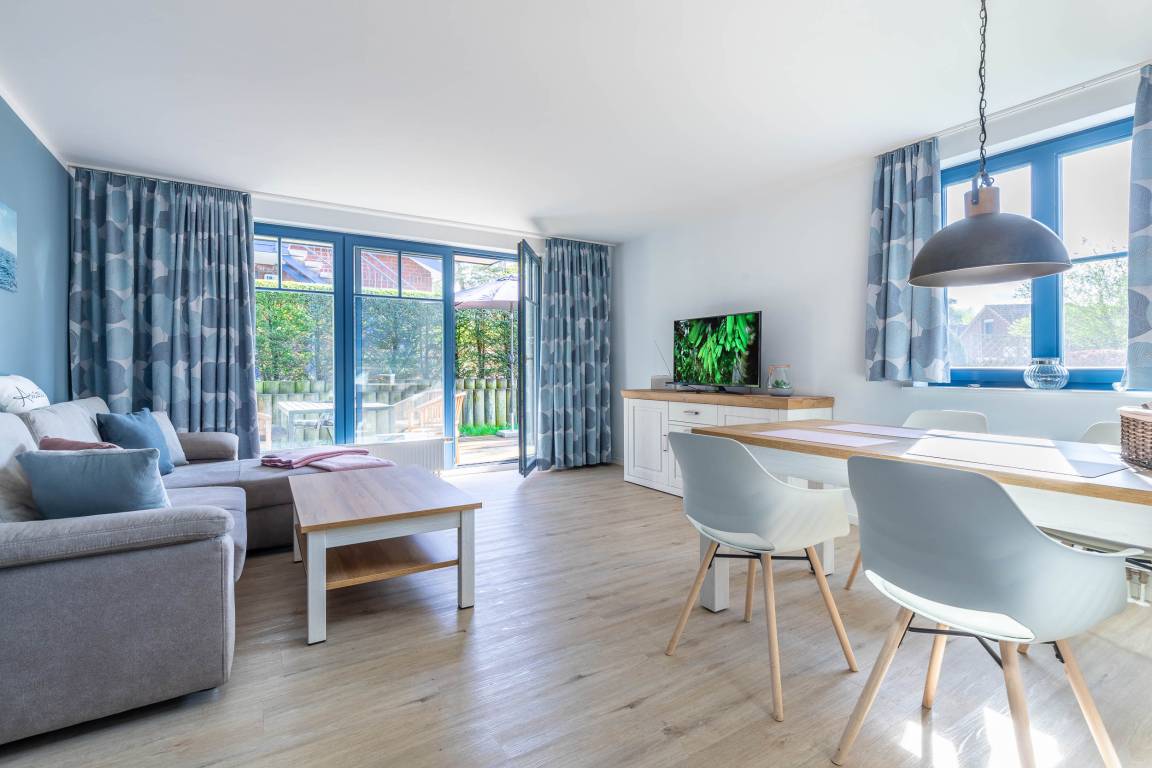 Die Wohnung wurde im Jahr 2020 umfassend renoviert und liebevoll im Landhausstil bzw. Skandinavischen Stil eingerichtet. Zur Ferienwohnung gehört ein kombinierter Wohn- und Essbereich mit einem bequemen Sofa, SAT-TV und Radio sowie einer schönen Essecke, wo Sie gemeinsam Ihre Mahlzeiten einnehmen können.