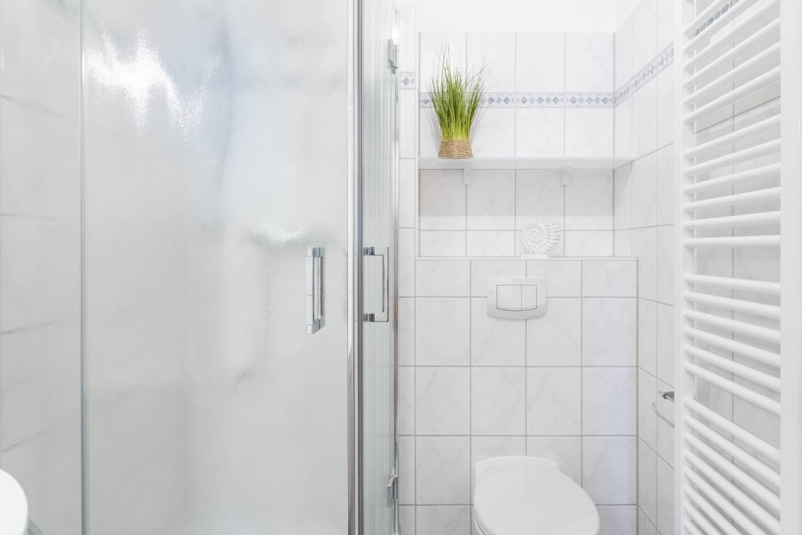 Ein modern eingerichtetes Duschbad mit WC, Handtuchheizung und Fußbodenheizung komplettiert diese zentrale Nichtraucher-Ferienunterkunft.