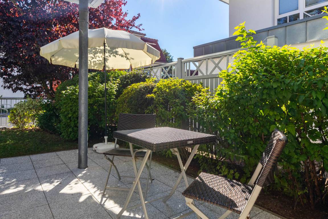 Vom Wohnzimmer aus gelangen Sie direkt auf die möblierte, teilweise sichtgeschützte Eckterrasse in Nordost-Südwest-Ausrichtung.