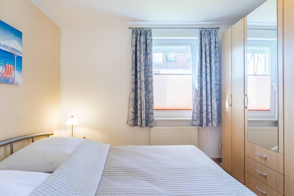 Das Schlafzimmer bietet ein bequemes Doppelbett (180x200cm/ Höhe 49cm), Kleiderschrank und einen weiteren Fernseher. Die Vorhänge und Außenrollos dienen hervorragend zum Abdunkeln.