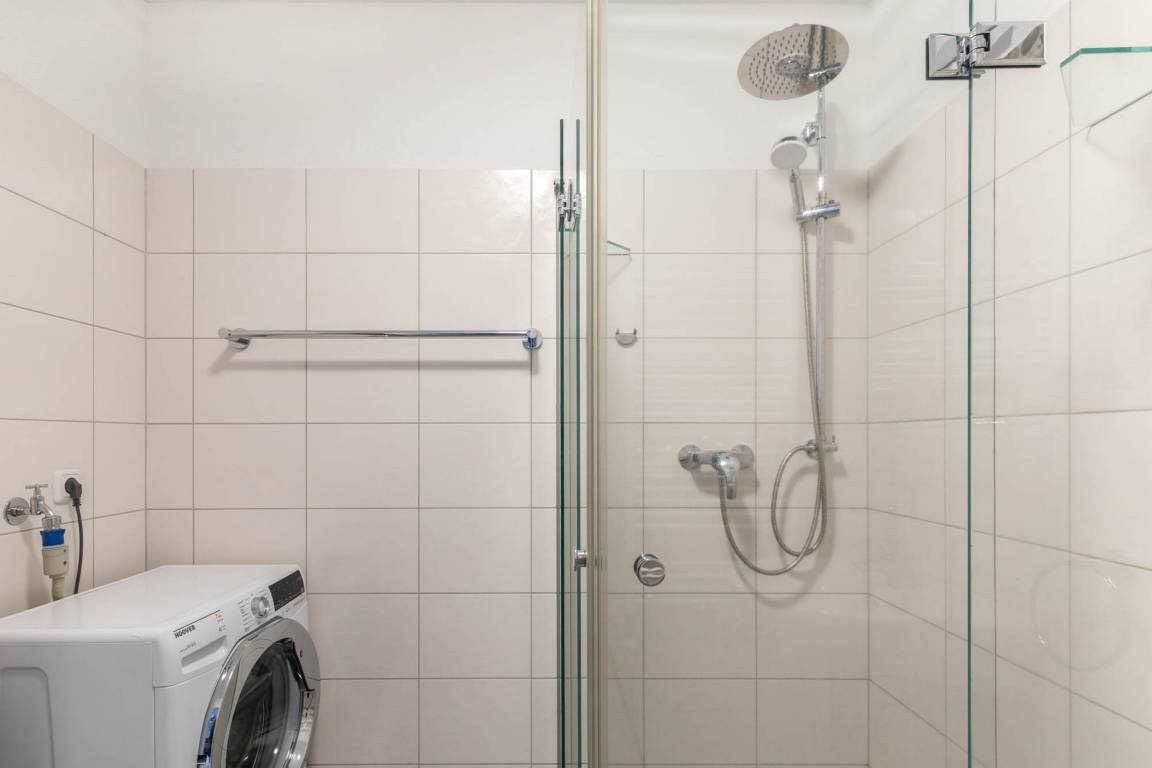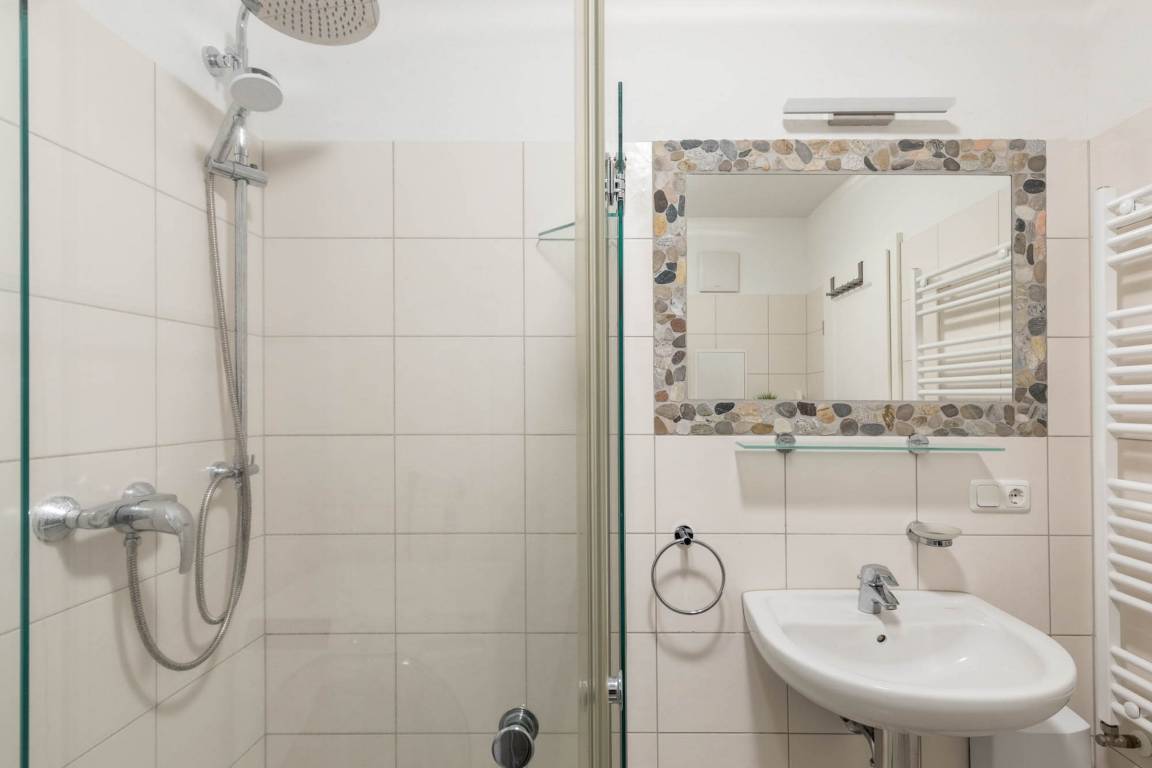 Das modern eingerichtete Badezimmer mit ebenerdiger Dusche und Handtuchwärmer, sowie einer kostenlos nutzbaren Waschmaschine, befindet sich ebenfalls in der unteren Wohnebene.