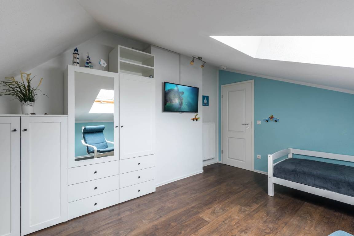 Das geräumige zweite Schlafzimmer mit großem Kleiderschrank und Flatscreen-Fernseher befindet sich auf der 2. Ebene (im DG). Zwei Einzelbetten, welche auch als Doppelbett gestellt werden können, bieten hier bis zu zwei Kindern, oder einem weiteren Pärchen einen erholsamen Schlaf."